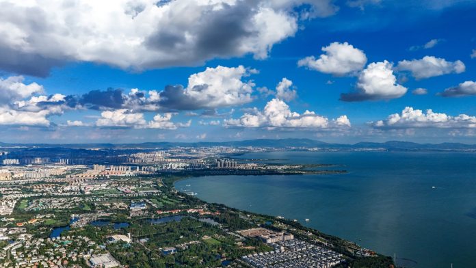 KUNMING (CINA) (XINHUA/ITALPRESS) – Una foto aerea, scattata da un drone il 3 settembre 2025, mostra un panorama del lago Dianchi, nella città di Kunming, nella provincia sud-occidentale cinese dello Yunnan. Secondo l’Ufficio di amministrazione del lago, la qualità dell’acqua si mantiene a un livello elevato da otto anni consecutivi.