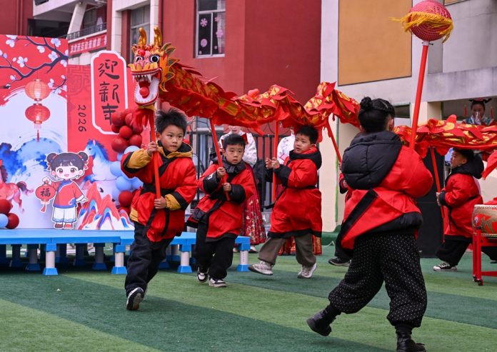PECHINO (CINA) (XINHUA/ITALPRESS) – Alcuni bambini eseguono una danza del drago in un asilo della contea di Xiayi, nella città di Shangqiu, nella provincia centrale cinese dello Henan, il 31 dicembre 2025. In tutta la Cina si sono svolte varie attività per celebrare il nuovo anno.