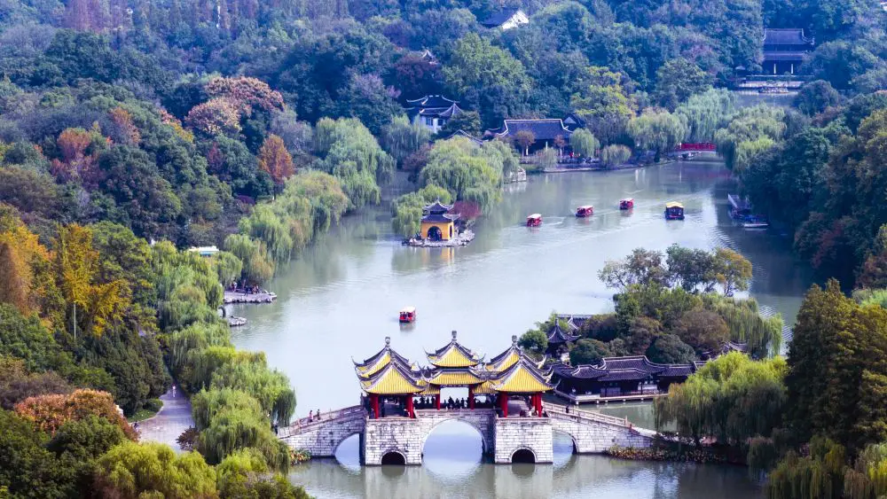 PECHINO (CINA) (ITALPRESS/XINHUA) – Una foto scattata da un drone il 30 ottobre 2025 mostra i visitatori che fanno un giro in barca per ammirare il paesaggio nel luogo panoramico Slender West Lake a Yangzhou, nella provincia cinese orientale di Jiangsu.