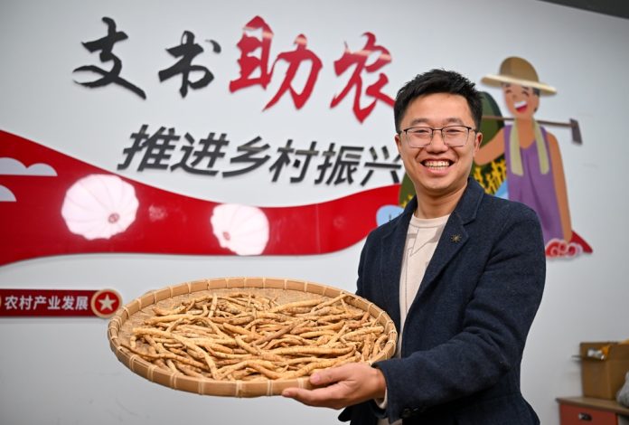 GUANGYUAN (CINA) (XINHUA/ITALPRESS) – Xie Aijun, segretario di Partito del villaggio di Xinghua, presenta i prodotti locali prima di una sessione di live streaming in un parco industriale digitale nella contea di Cangxi della città di Guangyuan, nella provincia sud-occidentale cinese del Sichuan, il 12 dicembre 2025. La contea di Cangxi ha messo a punto un modello innovativo per promuovere lo sviluppo rurale, che integra cooperative agricole familiari, piattaforme di live streaming e attività di marketing online e offline. In particolare, i segretari di Partito dei villaggi della contea stanno portando avanti delle sessioni di promozione dell’e-commerce, guidando le vendite delle specialità locali in tutto il Paese per migliorare in modo significativo il reddito degli agricoltori locali.
