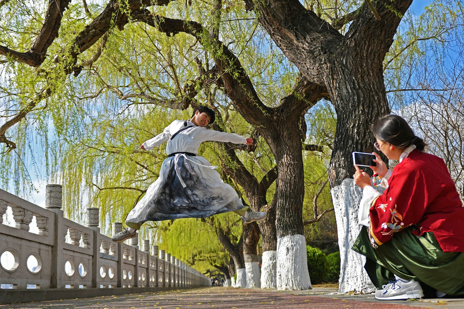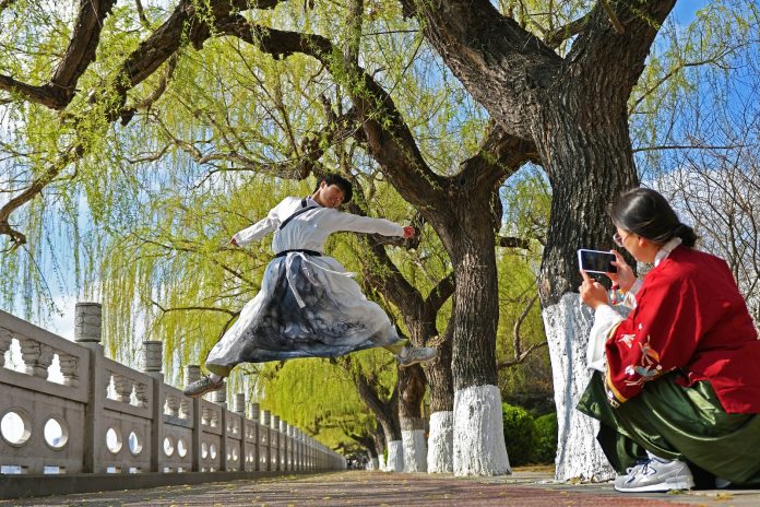 PECHINO (CINA) (XINHUA/ITALPRESS) – Una turista in abiti tradizionali cinesi posa per delle fotografie a Yantai, nella provincia orientale cinese dello Shandong, il 4 aprile 2026. La Festa di Qingming, o Giornata di pulizia delle tombe, quest’anno si è festeggiata il 5 aprile. Si tratta di una festività tradizionale cinese in cui le persone rendono omaggio ai defunti e venerano gli antenati. Le vacanze offrono anche una breve pausa ai cittadini cinesi per dedicarsi ad attività all’aria aperta e visite turistiche.