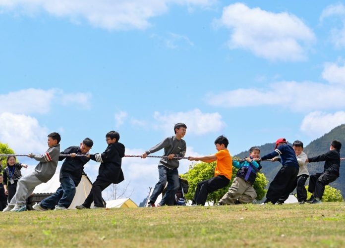PECHINO (CINA) (XINHUA/ITALPRESS) – Dei bambini giocano al tiro alla fune nell’area panoramica di Dieshihuagu, nella contea autonoma di Youyang Tujia e Miao, nella municipalità sud-occidentale cinese di Chongqing, il 3 aprile 2026. La Festa di Qingming, o Giornata di pulizia delle tombe, quest’anno si è festeggiata il 5 aprile. Si tratta di una festività tradizionale cinese in cui le persone rendono omaggio ai defunti e venerano gli antenati. Le vacanze offrono anche una breve pausa ai cittadini cinesi per dedicarsi ad attività all’aria aperta e visite turistiche.