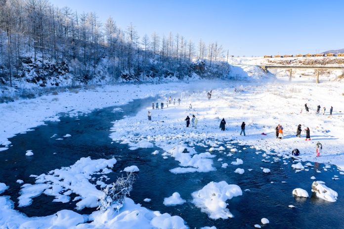ARXAN (CINA) (XINHUA/ITALPRESS) – Una foto aerea, scattata da un drone, mostra alcuni turisti che si divertono lungo il fiume Halha, nella città di Arxan a Hinggan League, nella regione autonoma settentrionale cinese della Mongolia Interna, il primo gennaio 2026. Nonostante il rigido freddo invernale di Arxan, questo tratto del fiume, influenzato dall’attività geotermica, non ghiaccia mai, attirando un gran numero di turisti in inverno.