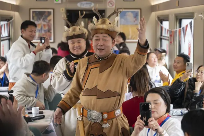 HARBIN (CINA) (XINHUA/ITALPRESS) – Artisti del gruppo etnico Oroqen si esibiscono per i passeggeri a bordo del treno Y783 il 26 novembre 2025. Tale treno, un convoglio turistico a tema ghiaccio e neve, è stato inaugurato alla stazione ferroviaria di Harbin e ha iniziato mercoledì un viaggio di sei giorni. Il treno mette in mostra il fascino della Cina nord-orientale attraverso decorazioni a tema, servizi di guida turistica e attività interattive, in uno sforzo di promozione del turismo invernale e per dare nuova vitalità all’economia del ghiaccio e della neve.