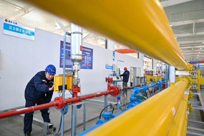 (260131) -- TIANJIN, Jan. 31, 2026 (Xinhua) -- Staff members adjust a pilot test platform for a pressure coupling device at Dekuang Jiuding (Tianjin) Technology Co., Ltd. in the Beijing-Tianjin Zhongguancun Tech Town, in Tianjin, north China, Jan. 23, 2026. As a key cooperation platform for Beijing and Tianjin to jointly implement the national strategy for the coordinated development of Beijing-Tianjin-Hebei region, the Beijing-Tianjin Zhongguancun Tech Town has registered a total of 2,060 entities of various types, realizing a combined annual production value of 1.873 billion yuan, or about 271 million U.S. dollars in 2025, a year-on-year growth of 15.62 percent. (Xinhua/Sun Fanyue)