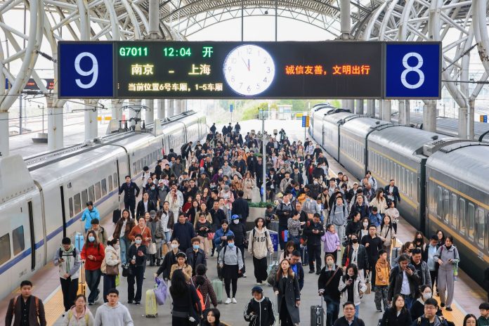 PECHINO (CINA) (XINHUA/ITALPRESS) – Passeggeri camminano su una banchina della stazione ferroviaria di Nanchino, a Nanchino, nella provincia orientale cinese del Jiangsu, il 3 aprile 2026. La Cina dovrebbe registrare 90,5 milioni di viaggi di passeggeri in treno da venerdì a martedì prossimo durante il previsto picco di traffico per le vacanze del Qingming Festival, secondo l’operatore ferroviario nazionale. Con una media attesa di 18,1 milioni di viaggi al giorno durante i cinque giorni di picco, il China State Railway Group ha previsto per sabato un picco di traffico con un totale giornaliero di 21,2 milioni di viaggi.