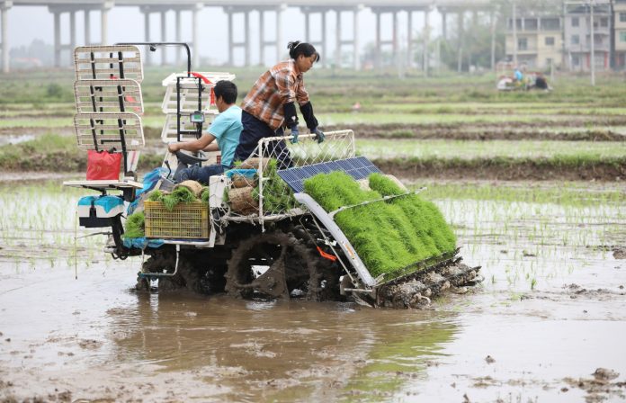 PECHINO (CINA) (XINHUA/ITALPRESS) – Questa foto, scattata l’8 aprile 2026, mostra degli agricoltori che si servono di un macchinario agricolo per seminare il riso di prima stagione in un campo a Yongzhou, nella provincia centrale cinese dello Hunan.