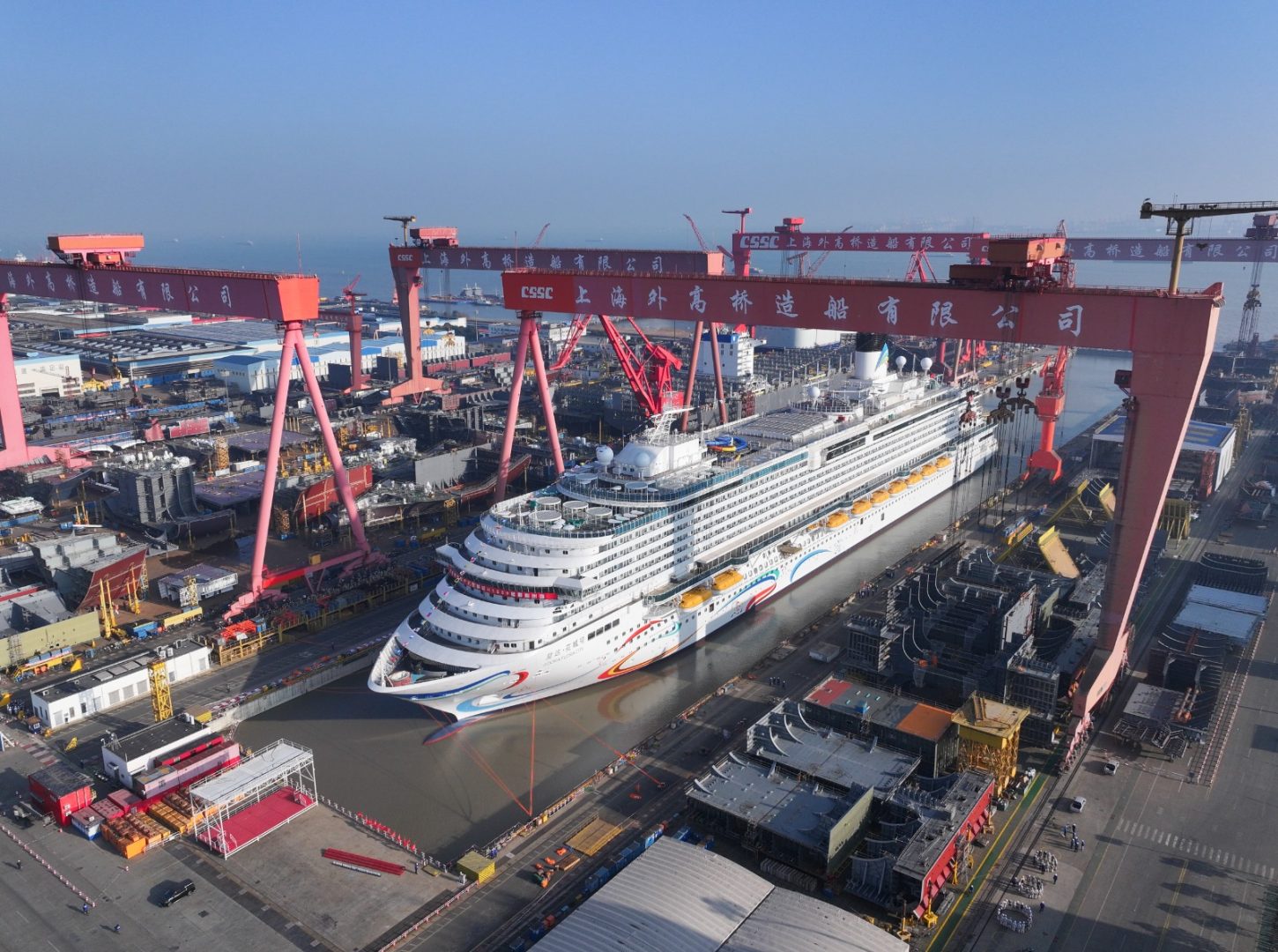 SHANGHAI (CINA) (XINHUA/ITALPRESS) – Una foto aerea, scattata da un drone il 14 marzo 2026, mostra la nave da crociera di grandi dimensioni “Adora Flora City” a Shanghai, nella Cina orientale. La seconda nave da crociera cinese di grandi dimensioni costruita a livello nazionale dovrebbe essere consegnata entro la fine del 2026, con la costruzione della sua struttura principale già completata, secondo il suo costruttore navale, la China State Shipbuilding Corporation (CSSC). La nave dovrebbe lasciare il molo il 20 marzo per la prossima fase di prova di ormeggio in banchina, mentre le prove in mare sono previste per la fine di maggio, ha affermato la CSSC. Con una stazza lorda di 141.900 tonnellate, questa nave rappresenta un ulteriore passo avanti nella capacità della Cina di costruire navi da crociera di grandi dimensioni. Rispetto alla prima nave di questo tipo, la Adora Magic City, la nuova imbarcazione presenta una serie di miglioramenti nella progettazione e nella costruzione. Secondo la società, la nave è più lunga di 17,4 metri, offre aree pubbliche ampliate e un maggiore comfort a bordo.