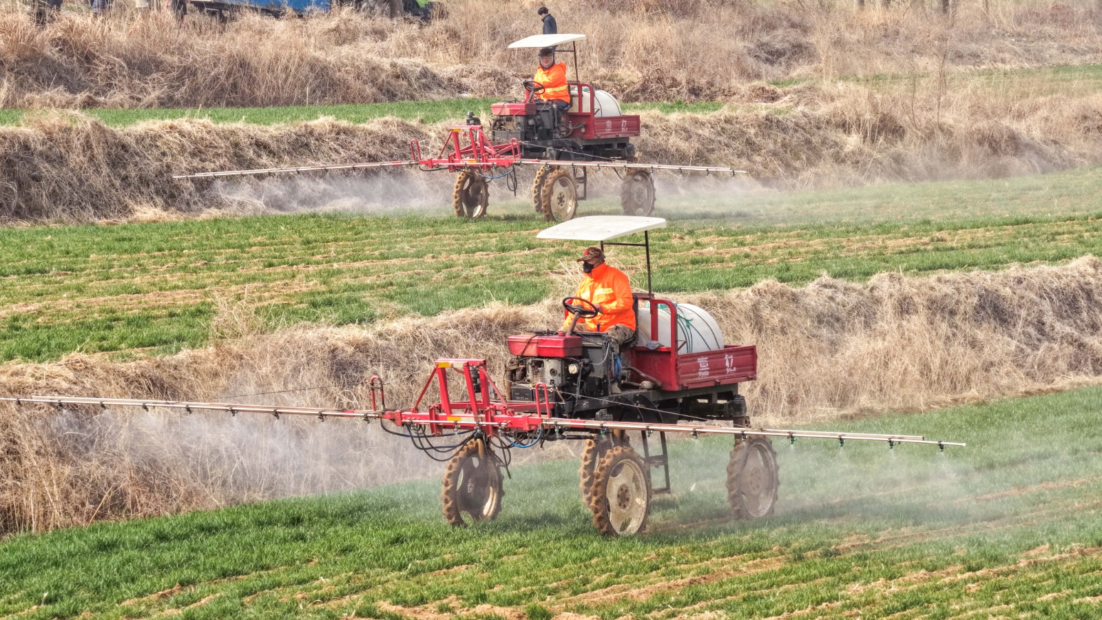 JINAN (CINA) (XINHUA/ITALPRESS) – Gli agricoltori spruzzano i fertilizzanti ed effettuano interventi di controllo dei parassiti e delle malattie sulle colture di grano nella cittadina di Hushan, a Rongcheng, nella provincia orientale cinese dello Shandong, il 23 marzo 2026. Dopo l’equinozio di primavera, gli agricoltori in tutto lo Shandong approfittano della stagione agricola per svolgere l’aratura primaverile.