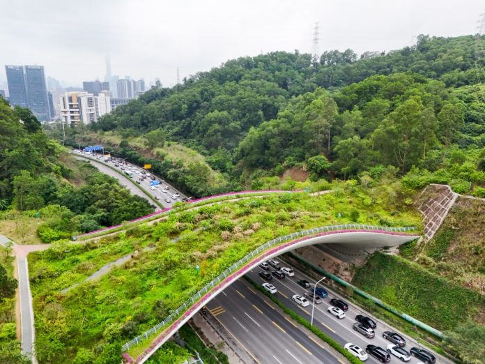 SHENZHEN (CINA) (XINHUA/ITALPRESS) – Una foto, scattata da un drone il 21 aprile 2026, mostra una veduta del ponte n.1 del Kunpeng Trail a Shenzhen, nella provincia meridionale cinese del Guangdong. Negli ultimi anni Shenzhen ha esplorato un percorso peculiare per la tutela della biodiversità nelle aree urbane, attraverso lo sviluppo di sentieri ecologici, la realizzazione di strutture eco-compatibili e l’attuazione di una gestione ecologica più accurata. Questi interventi hanno garantito spazio sufficiente agli habitat della fauna selvatica e alle rotte migratorie, creando “percorsi doppi” a sostegno della convivenza armoniosa tra esseri umani e animali selvatici.