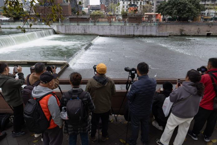 CHENGDU (CINA) (XINHUA/ITALPRESS) – Dei cittadini scattano foto agli aironi che si cibano nel fiume Jinjiang a Chengdu, nella provincia sud-occidentale cinese del Sichuan, il 17 marzo 2026. Un gran numero di questi esemplari di recente è rimasto per lungo tempo in fila controcorrente per cibarsi nel fiume Jinjiang, attirando molti cittadini a osservare e scattare foto.