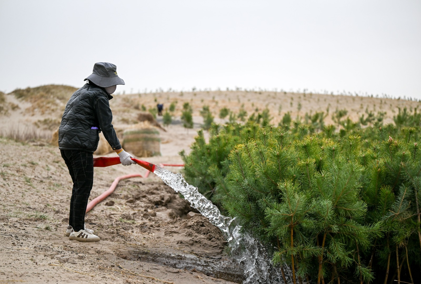 TONGLIAO (CINA) (XINHUA/ITALPRESS) – Un addetto irriga gli alberi in un’area dedicata a un progetto di lotta alla desertificazione nella Horqin Left Wing Rear Banner della città di Tongliao, nella regione autonoma della Mongolia Interna, nel nord della Cina, il 19 aprile 2026. L’area sabbiosa si estende per quasi 3.000 mu (200 ettari) ed è l’ultima porzione di terreno sabbioso mobile e semimobile ancora da trattare nella Horqin Left Rear Banner.