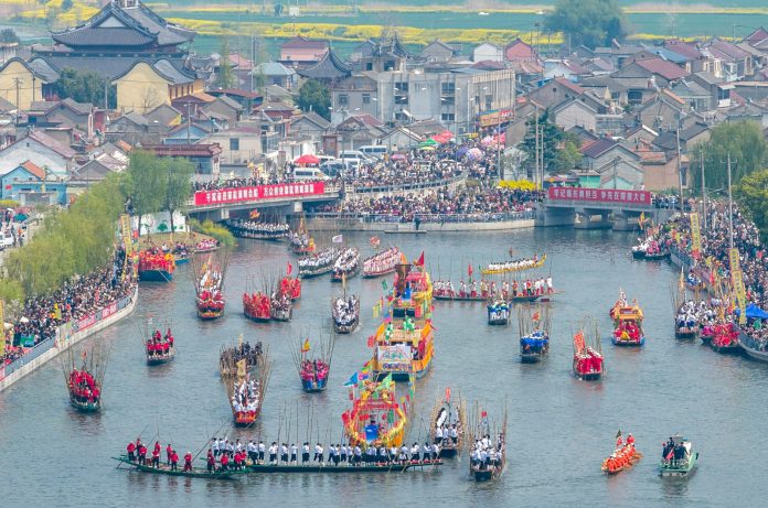 XINGHUA (CINA) (XINHUA/ITALPRESS) – Una foto aerea, scattata da un drone il 5 aprile 2026, mostra delle imbarcazioni in navigazione durante la fiera delle barche di Maoshan nella città di Xinghua, nella provincia orientale cinese del Jiangsu. La fiera annuale si è tenuta qui ieri. L’evento è stato inserito nel 2014 nell’elenco del patrimonio culturale immateriale nazionale.