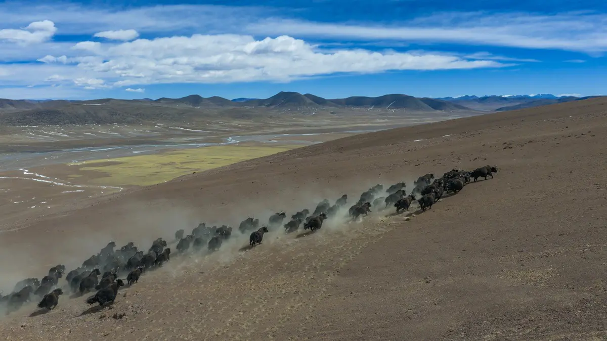 LHASA (CINA) (XINHUA/ITALPRESS) – Una foto aerea scattata con drone il 10 marzo 2026 mostra un branco di yak selvatici che corre nei pressi del ghiacciaio Zangser Kangri nella riserva naturale nazionale di Changtang, nella regione autonoma dello Xizang, nel sud-ovest della Cina. Il 21 marzo si è celebrata la Giornata mondiale dei ghiacciai.