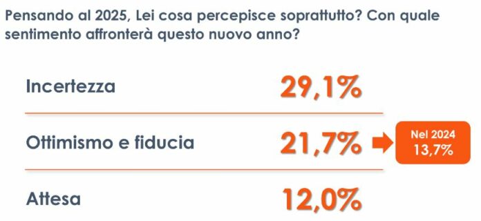 ROMA (ITALPRESS) – Si apre un nuovo anno che chiude il primo quarto di secolo di questo nuovo millennio. Come spesso accade, questo coincide con le prime previsioni, prospettive e propositi per il futuro che verrà. Anche per questo 2025, il sentimento che prevale tra la popolazione italiana è l’incertezza. Gli scenari nazionali e internazionali lasciano quasi 1 italiano su 3 (il 29,1%) “in bilico” su quelli che saranno gli sviluppi futuri. C’è però un dato positivo che vede una netta crescita di coloro che si approcciano al nuovo anno con ottimismo e fiducia. Nel complesso, questo intreccio tra incertezza e positività porta ad una netta divisione del campione tra chi guarda al 2025 con ottimismo e chi, invece, con pessimismo, mentre 1 italiano su 5 non ha ancora un’idea precisa in merito.