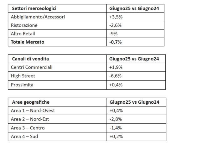 Quanto al raffronto gennaio-giugno rispetto allo stesso periodo 2024, i dati confermano un semestre che chiude a -1,9%. La nota positiva riguarda il comparto abbigliamento-accessori che ha tenuto meglio del previsto con -0,4%, la ristorazione flette a -1,9%, altro retail sprofonda a -5,4%.