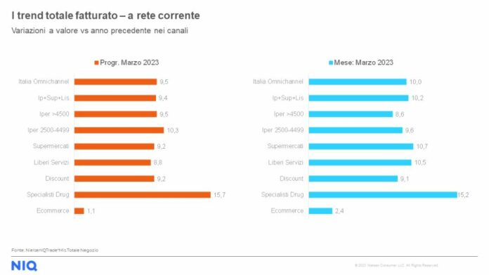 A marzo la distribuzione in Italia continua con un trend positivo del fatturato, registrando ricavi pari a 9 miliardi a totale omnichannel, in crescita del +10% rispetto alla performance dello scorso anno. E’ quanto emerge dai dati dell’analisi NielsenIQ sull’andamento dei consumi e alle abitudini di acquisto delle famiglie italiane. Stando ai dati di NIQ, l’indice di inflazione teorica nel largo consumo confezionato (LCC), ovvero il settore di mercato che comprende tutti i beni di consumo primario e i prodotti confezionati dall’industria, è pari al 15,6% a marzo. La variazione reale dei prezzi, al netto di una riduzione dello 0,9% del mix del carrello della spesa, si attesta al 14,7%. A marzo tutti i canali distributivi riportano un andamento positivo rispetto allo stesso periodo del 2022. Nello specifico, guidano la crescita gli specialisti drug (+15,2%), seguiti da supermercati (+10,7%), liberi servizi (+10,5%), superstore (+9,6%), discount (+9,1%) e iper>4.500mq (+8,6%). La ricerca di NielsenIQ evidenzia inoltre che l’incidenza promozionale (a totale Italia) nel mese trascorso è pari al 23,4%, in aumento di 0,3 punti percentuali rispetto allo stesso periodo del 2022. Infine, l’acquisto di prodotti a marchio del distributore si attesta al 22,4% del LCC nel perimetro iper, super e liberi servizi mentre è del 30,9% a totale Italia omnichannel, inclusi i discount. Come da diversi mesi a questa parte, anche a marzo le aree merceologiche con l’incremento a valore più significativo sono i prodotti dedicati agli animali domestici (18,1%) e il cibo confezionato (+11,7%). Per quanto riguarda l’andamento a volume, il pet food manifesta una riduzione del -5,4% mentre il food confezionato diminuisce del 3,4%. Il fresco mantiene la propria crescita in tutti i format distributivi: nello specifico il trend migliore si osserva negli iper>4500 (+10,6%), mentre i superstore registrano l’incremento minore tra tutti i canali (9,2%). Per quanto riguarda la relazione valore e volume in ambito grocery, rispetto all’anno precedente, a totale Italia omnichannel il trend a valore cresce del 9,9% mentre a volume si riduce del 4,8%. Formaggi (+18,8%), pane-pasticceria-pasta (+18,1%) e gastronomia (10%) sono le aree merceologiche più dinamiche a totale canali mentre i trend di crescita più bassi rimangono, anche a marzo, quelli registrati dai comparti pescheria (+5,2%) e frutta e verdura (+5,2%). A livello di prodotto, complice il periodo pasquale, guidano la Top 10 del mese uova di cioccolato (95,7%), colombe (94,7%) e fazzoletti di carta (49,4%).