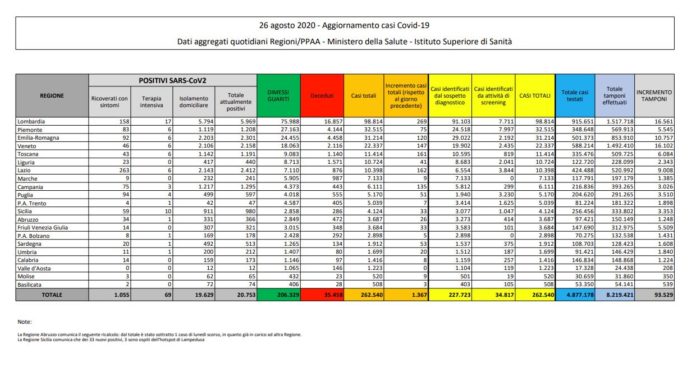 MILANO (ITALPRESS) – Sono 1.367 i nuovi positivi al Coronavirus nelle ultime 24 ore. Un numero nettamente superiore rispetto alla giornata di ieri quando l’aumento era stato di 878 casi. Il totale delle persone attualmente contagiate è di 20.753, quasi mille più di ieri. E’ quanto emerge dal quotidiano Bollettino del Ministero della Salute e della Protezione Civile. I casi totali registrati da inizio pandemia passano quindi a 262.540. Il numero di decessi nelle ultime 24 ore sale di 13, arrivando ad un totale di 35.458. Le persone attualmente ricoverate con sintomi sono 1.055 (3 in meno di ieri), dei quali 69 sono in terapia intensiva (tre in più di ieri) e 19.629 in isolamento domiciliare. I tamponi effettuati nelle ultime 24 ore sono 93.539, quasi 20 mila in più di ieri, soprattutto a causa dei test al personale scolastico e ai rientri dai paesi a rischio. La Valle d’Aosta è l’unica regione che nelle ultime 24 ore non ha registrato nemmeno un positivo, mentre la regione che fa registrare il maggior numero di nuovi casi è la Lombardia con 269, seguita dal Lazio con 162 e dalla Toscana con 161.