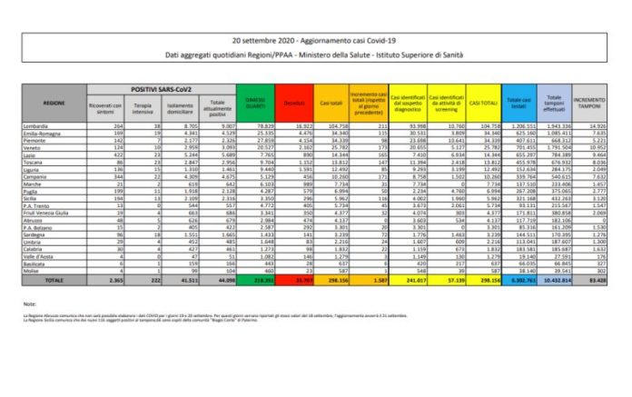 ROMA (ITALPRESS) – Sono 1.587 i nuovi contagi da Coronavirus registrati nelle ultime 24 ore e 15 i decessi che portano il totale delle vittime a 35.707. Nelle ultime 24 ore sono stati eseguiti 83.428 tamponi, per un totale di 10.432.814 da inizio emergenza. E’ quanto si legge nel bollettino del Ministero della Salute e della Protezione Civile di oggi. Il totale dei dimessi/guariti è di 218.351 (+635), mentre gli attuali positivi sono 44.098 (+937). Ad oggi sono 2.365 i ricoverati con sintomi, di questi 222 si trovano in terapia intensiva, mentre in isolamento domiciliare ci sono 41.511 persone. Le regioni dove è stato registrato il maggior numero di nuovi casi, nelle ultime 24 ore, sono Lombardia (211), Veneto (173), Campania (171) e Lazio (165).