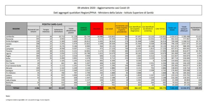 Superiore di Sanità. Aumentano anche i decessi, che salgono a 28 (+6 rispetto a ieri). Record di tamponi: 129.471, in aumento rispetto ai 128.098 mila di ieri. Gli attualmente positivi sono 70.110 (+4.18). In crescita i ricoverati con sintomi, oggi sono 4.086 (+161), di questi 387 (+29) si trovano in terapia intensiva. In isolamento domiciliare invece ci sono 65.637 persone. Gli aumenti maggiori di casi in Lombardia (983), Campania (757), Veneto (595). La regione con l’incremento minore è il Molise (11).