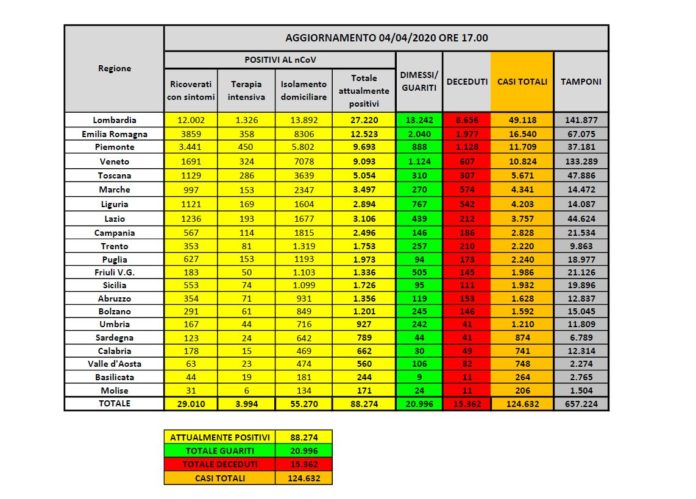 Complessivamente 124.632 persone in Italia sono risultate positive al coronavirus finora. Attualmente sono 88.274 le persone positive, con un incremento di 2.886 rispetto a ieri quando l’aumento era stato di 2.339 unita’. Lo ha reso noto la Protezione Civile.