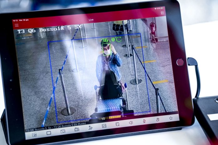 EMERGENZA CORONAVIRUS COVID-19 AEROPORTO INTERNAZIONALE LEONARDO DA VINCI FIUMICINO TERMINAL 3 IMBARCHI GATES TERMOSCANNER TERMO SCANNER RILEVAMENTO CONTROLLO MISURAZIONE TEMPERATURA CORPOREA FEBBRE AEROPORTI DI ROMA ADR