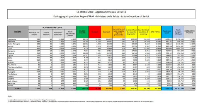 ROMA (ITALPRESS) – Sono 5.901 i nuovi casi di Coronavirus fatti registrare in Italia nelle ultime 24 ore, 1.282 in più di quelli fatti registrare ieri. Un aumento dovuto anche al numero superiore di tamponi effettuati: 112.544 contro gli 85.442 di ieri. E’ quanto emerge dal quotidiano bollettino sull’emergenza Covid-19, pubblicato dal ministero della Salute. Ad oggi sono 365.467 le persone che hanno contratto il virus in Italia, mentre il totale dei tamponi ha raggiunto quota 12.762.699.