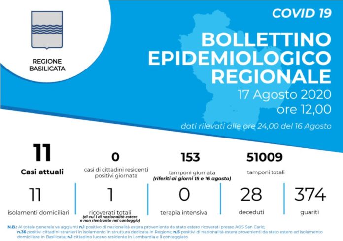 Ai positivi vanno aggiunti nel complesso 28 persone decedute (9 di Potenza, 2 di Paterno, 1 di Spinoso, 2 di Moliterno, 1 di Villa d’Agri, 2 di Rapolla, 1 di Irsina, 1 di Montemurro, 1 di Pisticci, 2 di Matera, 1 di San Costantino Albanese, 2 di Avigliano, 1 di Tursi, 1 di Aliano, 1 di Bernalda); 374 guariti; 1 cittadino lucano residente in Lombardia e lì conteggiato; 1 persona di nazionalità estera ricoverata all’Ospedale ‘San Carlò, 5 persone di nazionalità estera che si trovano in isolamento domiciliare in Basilicata; 36 cittadini stranieri in isolamento in una struttura lucana dedicata.