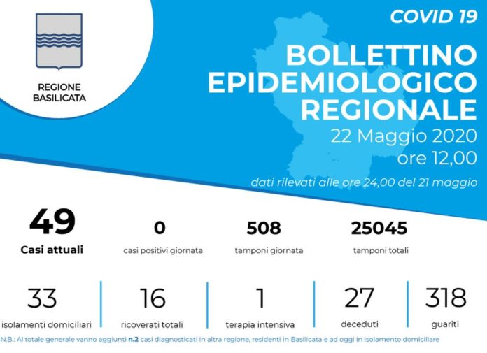Con questo aggiornamento i casi di contagio confermati in tutta la regione sono 49. Ieri erano 60, ai quali vanno sottratte le 11 persone guarite ieri. Il totale dei guariti è di 318. Ai 49 positivi vanno aggiunti nel complesso 27 persone decedute (9 di Potenza, 2 di Paterno, 1 di Spinoso, 1 di Moliterno, 1 di Villa d’Agri, 2 di Rapolla, 1 di Irsina, 1 di Montemurro, 1 di Pisticci, 2 di Matera, 1 di San Costantino Albanese, 2 di Avigliano, 1 di Tursi, 1 di Aliano, 1 di Bernalda), 307 guariti, 1 paziente di Gravina di Puglia riscontrato dall’Asm, 2 pazienti diagnosticati in altre regioni, residenti in Basilicata dove si trovano in isolamento domiciliare ed 1 paziente residente a Torino che si trova in isolamento domiciliare in Basilicata.