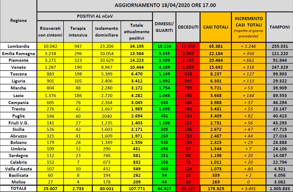 Nel dettaglio, i casi attualmente positivi sono 34.195 in Lombardia, 13.584 in Emilia-Romagna, 14.223 in Piemonte, 10.444 in Veneto, 6.470 in Toscana, 3.412 in Liguria, 3.172 nelle Marche, 4.282 nel Lazio, 3.045 in Campania, 1.985 nella Provincia autonoma di Trento, 2.694 in Puglia, 1.403 in Friuli Venezia Giulia, 2.171 in Sicilia, 1.971 in Abruzzo, 1.556 nella Provincia autonoma di Bolzano, 431in Umbria, 881 in Sardegna, 832 in Calabria, 549 in Valle d’Aosta, 262 in Basilicata e 209 in Molise.