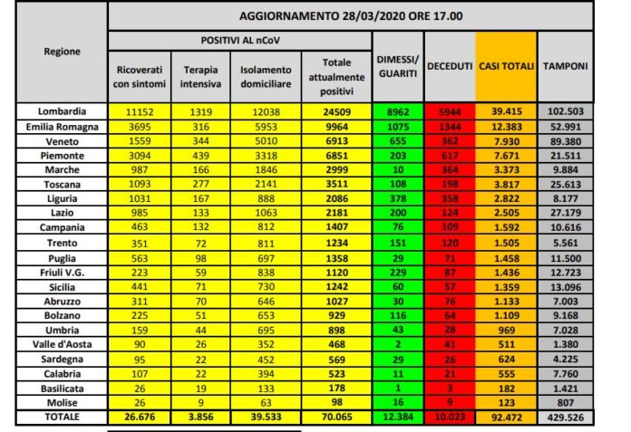 Sono 12.384 le persone guarite, con un aumento di 1.434 unita’ rispetto a ieri. I deceduti sono 10.023, 889 in piu’ rispetto al dato complessivo alla data di ieri, ma questo numero potra’ essere confermato solo dopo che l’Istituto Superiore di Sanita’ avra’ stabilito la causa effettiva del decesso.