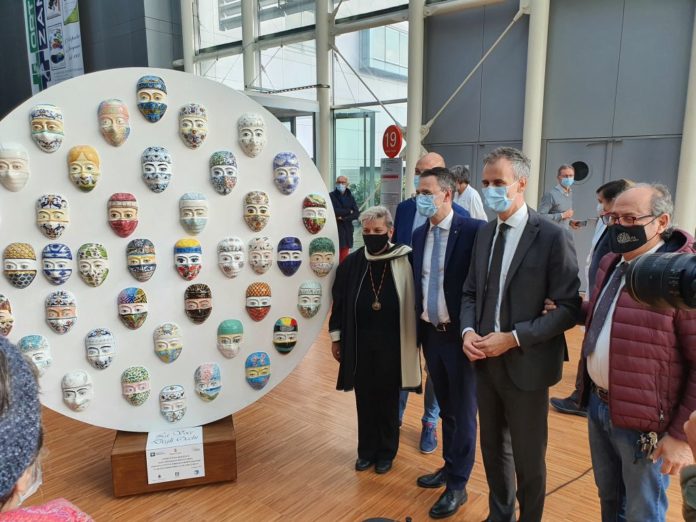 BERGAMO (ITALPRESS) – “Bergamo e il suo ospedale sono diventati un simbolo dell’epidemia. Qui il virus si è particolarmente accanito, ma proprio qui abbiamo assistito e assistiamo a toccanti manifestazioni di volontà, forza, coraggio. Qui c’è una straordinaria comunità, che ha dato prova di non voler lasciare nessuno indietro, di volersi occupare di tutti. Quest’opera, il primo monumento dedicato alle vittime del Covid-19 e al lavoro di medici e operatori sanitari, destinato ad entrare nei libri di storia, è giusto rimanga in questo territorio, che è diventato che è diventato un emblema dell’impegno contro la pandemia” Così il Presidente del Consiglio regionale della Lombardia Alessandro Fermi, questa mattina a Bergamo, durante la cerimonia di installazione de “La Voce degli occhi”, la scultura raffigurante 90 volti in ceramica coperti allo stesso modo cui oggi tutti siamo obbligati per contenere la diffusione del contagio, realizzata dai ceramisti di Deruta (Perugia) e Gzhel (Russia), e dedicata alle vittime del Covid-19 e agli operatori sanitari, donata da Regione Lombardia all’ASST Papa Giovanni XXIII in riconoscenza degli sforzi compiuti nella lotta contro il Coronavirus.