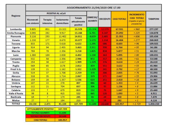 Ad oggi il totale delle persone che hanno contratto il coronavirus che causa il Covid-19 è 183.957, con un incremento rispetto a ieri di 2.729 nuovi casi. Il numero totale di attualmente positivi è di 107.709, con un decremento di 528 assistiti rispetto a ieri. Lo rende noto la Protezione Civile, che sottolinea come non “sia mai stato così alto il numero di pazienti dimessi e guariti”.