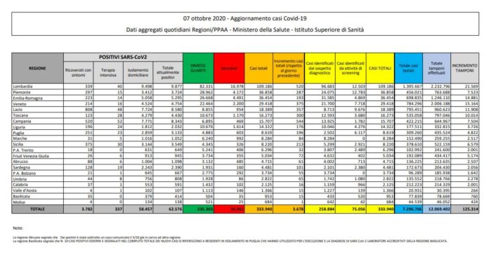 ROMA (ITALPRESS) – Impennata dei casi di contagi di Coronavirus in Italia. Nelle ultime 24 ore i nuovi positivi – secondo il consueto bollettino reso noto dal ministero della Salute – sono 3.678, poco più di mille rispetto a ieri, quando erano stati 2.667. Ma sono molti di più i tamponi: 125.312 mila (ieri erano 99.742). E continua pure la crescita dei decessi: 31 (+3 rispetto a ieri). Il totale dei 235.303 (+1204), mentre gli attuali positivi sono 62.576(+2.442). Ad oggi sono 3.782 (+156) i ricoverati con sintomi, 337(+18) si trovano in terapia intensiva, mentre in isolamento domiciliare ci sono 58.457 persone. Le regioni con il maggior numero di nuovi casi sono Campania (544), Lombardia (520), Veneto (375) e Lazio (357). La regione con l’incremento minore è il Molise (1).