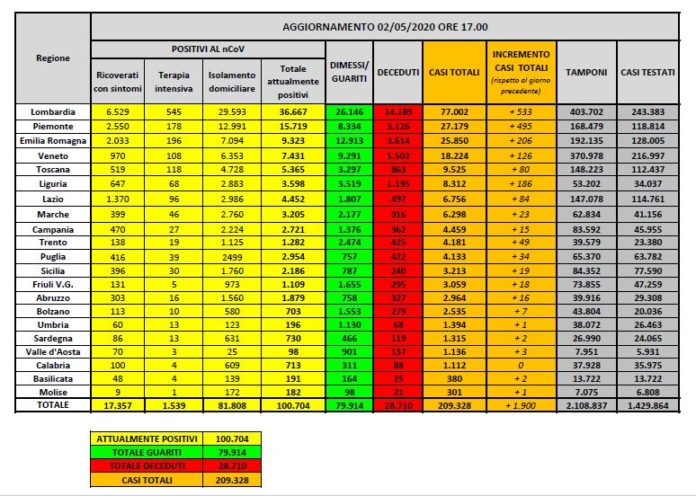 Al 2 maggio il totale delle persone che hanno contratto il coronavirus che causa il Covid-19 è 209.328, con un incremento rispetto a ieri di 1.900 nuovi casi. Il numero totale di attualmente positivi è di 100.704, con un calo di 239 assistiti rispetto a ieri.