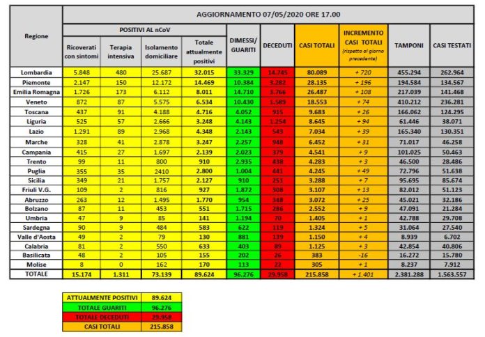 Al 7 maggio in Italia il totale delle persone che hanno contratto il coronavirus che causa il Covid-19 è 215.858, con un incremento rispetto a ieri di 1.401 nuovi casi. Il numero totale di attualmente positivi è di 89.624, con una decrescita di 1.904 assistiti rispetto al 6 maggio. Lo rende noto la Protezione Civile.