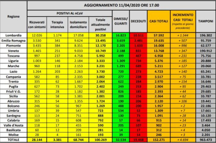 Complessivamente 152.271 persone in Italia sono risultate positive al coronavirus finora. Attualmente sono 100.269 le persone positive, con un incremento di 1.996 rispetto a ieri quando l’aumento era stato di 1.396 unita’. Lo ha reso noto il capo della Protezione Civile Angelo Borrelli. Sono 32.534 le persone guarite, con un aumento di 2.079 unita’ rispetto a ieri. I deceduti sono 19.468, 619 in piu’ rispetto al dato complessivo alla data di ieri, ma questo numero potra’ essere confermato solo dopo che l’Istituto Superiore di Sanita’ avra’ stabilito la causa effettiva del decesso. I ricoverati con sintomi sono ora 28.144, quelli in terapia intensiva 3.381. In isolamento domiciliare 68.744 persone. I tamponi effettuati in totale sono 963.