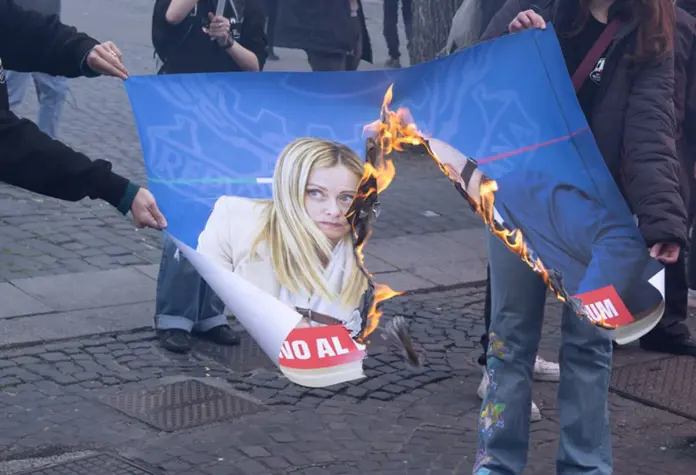 ROMA (ITALPRESS) – Nel corso del corteo per il no al referendum, organizzato a Roma, in piazza dell’Esquilino, alcuni manifestanti hanno incendiato le immagini simboliche della presidente Giorgia Meloni raffigurata mentre tiene al guinzaglio il ministro Carlo Nordio, con una museruola, accanto alla scritta: “No al vostro referendum”. Poco dopo è stato dato alle fiamme anche un altro manifesto che mostrava la premier mentre stringe la mano a Benjamin Netanyahu. A fuoco anche una bandiera degli Stati Uniti e un ritratto del