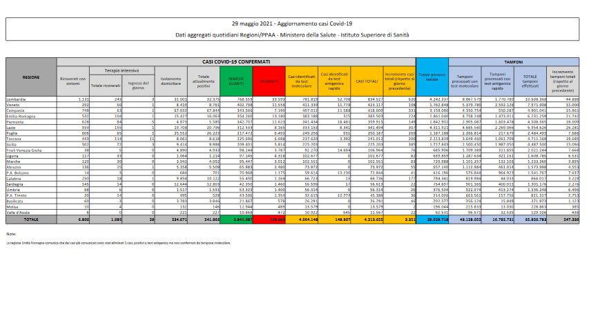 ROMA (ITALPRESS) – Sono 3.351 i nuovi casi di Coronavirus in Italia (ieri 3.738) a fronte di 247.330 tamponi effettuati su un totale di 65.920.783 da inizio emergenza. E’ quanto si legge nel bollettino del Ministero della Salute-Istituto Superiore di Sanità di oggi. Nelle ultime 24 ore sono stati 83 i decessi (ieri 126), che portano il totale di vittime da inizio pandemia a 126.002. Con quelli di oggi diventano 4.213.055 i casi totali di Covid in Italia. Attualmente i positivi sono 241.966 (-4.304), 234.071 le persone in isolamento domiciliare. I ricoverati in ospedale con sintomi sono 6.800 di cui 1.095 in Terapia intensiva. I dimessi/guariti sono 3.845.087 con un incremento di 7.569 unità nelle ultime 24 ore.