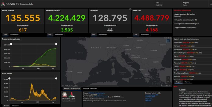 ROMA (ITALPRESS) – Sono 4.168 (ieri erano stati 5.923) i nuovi casi Covid registrati nelle ultime 24 ore in Italia con 101.341 tamponi e 44 morti. Lo riferisce il bollettino del ministero della Salute. Il tasso di positività si attesta al 4,1% in aumento dal 3,4% della precedente rilevazione. Sono 485 le terapie intensive in Italia per Covid, 13 in più rispetto a ieri con 45 nuovi ingressi. 3.928 i ricoveri ordionari, 161 in più nelle ultime 24 ore. Gli attualmente positivi sono 135.555 (+617 nelle ultime 24 ore), 4.224.429 i dimessi/guariti da inizio emergenza (+3.505). Le persone in isolamento domiciliare sono 131.142.
