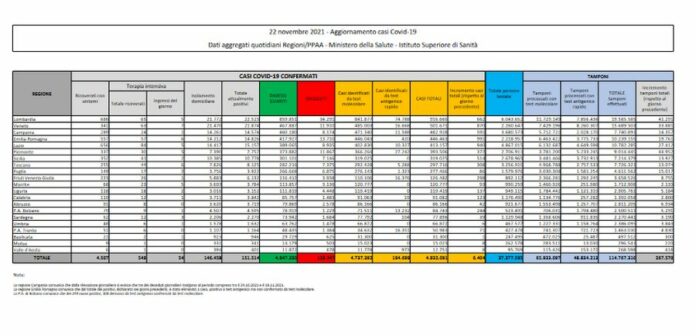 La regione Emilia Romagna comunica che dal totale dei positivi, dichiarato nei giorni precedenti, è stato eliminato 1 caso, positivo a test antigenico ma non confermato da test molecolare. La P.A. di Bolzano comunica che dei 244 nuovi positivi, 108 derivano da test antigenici confermati da test molecolare.
