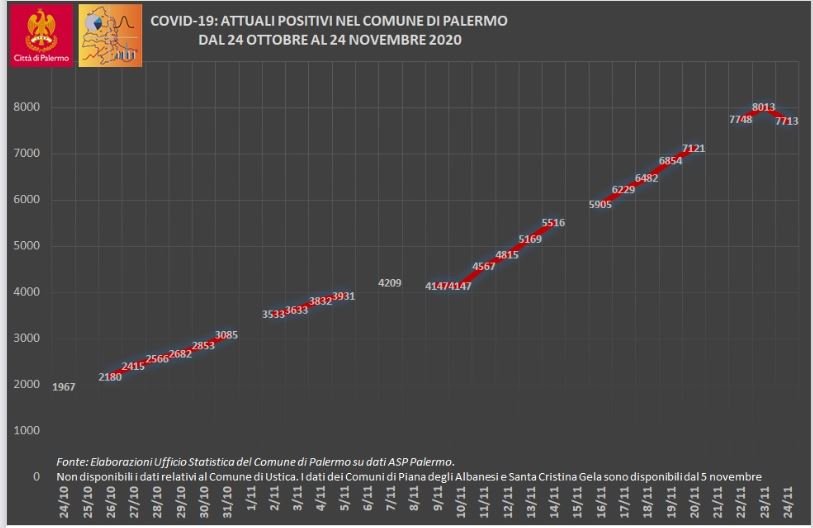 PALERMO (ITALPRESS) – Dopo un mese, calano per la prima volta gli attuali positivi a Palermo e in provincia. E’ quanto emerge dal report del Comune sulla situazione Covid nell’area metropolitana, che si basa sui dati forniti dalla Asp. Ieri, infatti, nel capoluogo il numero degli attuali positivi era di 7.713, 300 in meno del giorno precedente. Dal 26 ottobre, quando i contagiati erano 2.180, la curva è stata sempre in crescita. Situazione analoga nella provincia: il 24 novembre gli attuali positivi erano 10.802, il 23 novembre erano 11.126, oltre 300 in più.