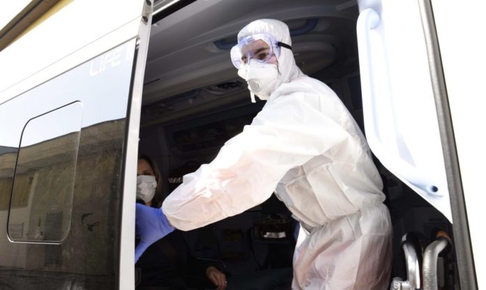 BERGAMO AMBULANZA PAZIENTE CORONAVIRUS INFERMIERE EMERGENZA CORONAVIRUS CORONA VIRUS COVID19 COVID 19 ITALIA ZONA ROSSA TUTA USA E GETTA TUTA ANTI CONTAGIO MASCHERINA MASCHERINA CHIRURGICA