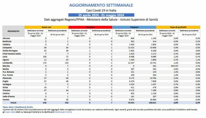 ROMA (ITALPRESS) – Lieve aumento dei casi e del tasso di positività. Lo rileva il bollettino Covid del ministero della Salute riferito alla settimana 25 aprile – 1 maggio 2024. Si registrano: 618 nuovi casi positivi con una variazione di +17,0% rispetto alla settimana precedente (n: 528), 9 deceduti con una variazione di +28,6% rispetto alla settimana precedente (n: 7), 76.553 tamponi effettuati con una variazione di -23,9% rispetto alla settimana precedente (n: 100.622).