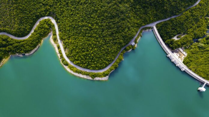 Beautiful lake coastline on lake with road and dam Lake Turano in Italy