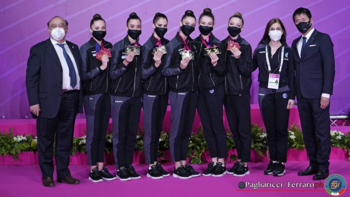 PESARO (ITALPRESS) – La Squadra Nazionale di Ginnastica Ritmica ha vinto due medaglie d’oro nelle finali di specialità della World Cup di Pesaro 2021. Le Farfalle azzurre della Direttrice Tecnica Emanuela Maccarani – gli avieri dell’Aeronautica Militare Alessia Maurelli, Martina Centofanti, Martina Santandrea, Agnese Duranti, Daniela Mogurean (Ardor Padova) e la riserva Laura Paris (Moderna Legnano) – sono salite sul gradino più alto del podio nella Final Eight con le 5 palle, grazie al punteggio di 46.950, mettendosi alle spalle la Russia (45.350 pt.) e il Giappone (43.800 pt.). Poi hanno fatto il bis anche nella finale con tre cerchi e quattro clavette, trionfando con il totale di 44.150 e battendo nuovamente la Russia (43.200 pt.) e Israele (41.600).