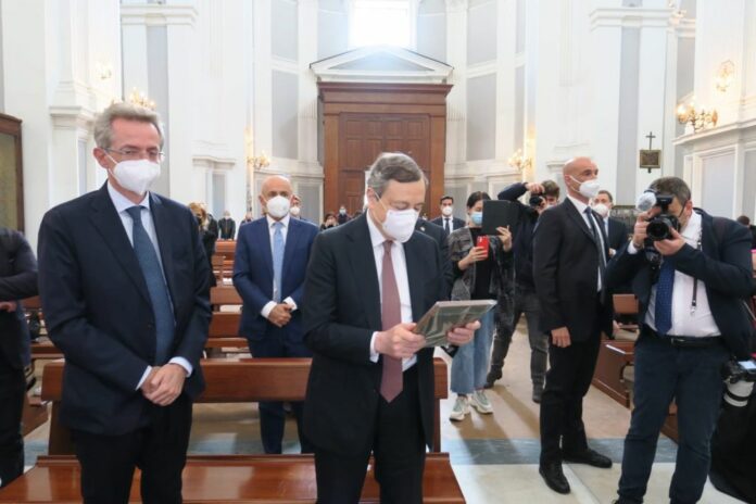 NAPOLI (ITALPRESS) – Il premier Mario Draghi ha incontrato la Comunità del Rione Sanità nella Basilica di Santa Maria della Sanità. Dopo la cerimonia della firma per il “Patto per Napoli” tenutasi nella sala dei Baroni del Maschio Angioino, il capo del governo è stato accolto al Rione Sanità da Carlo Borgomeo, Presidente della Fondazione Con il Sud, Mons. Gaetano Castello Vescovo ausiliare, Antonio Loffredo parroco del Rione Sanità e dai tanti volontari della Fondazione di Comunità San Gennaro. Presente anche l’orchestra giovanile del quartiere “Sanitansamble” che, diretta dal Maestro Paolo Acunzo, ha voluto celebrare l’arrivo di Draghi al Rione Sanità con l’inno nazionale ucraino, poi seguito dall’inno nazionale italiano. Un omaggio – simbolico – al Premier, ma anche alle famiglie ucraine che in queste settimane hanno trovato ospitalità e accoglienza al Rione Sanità.