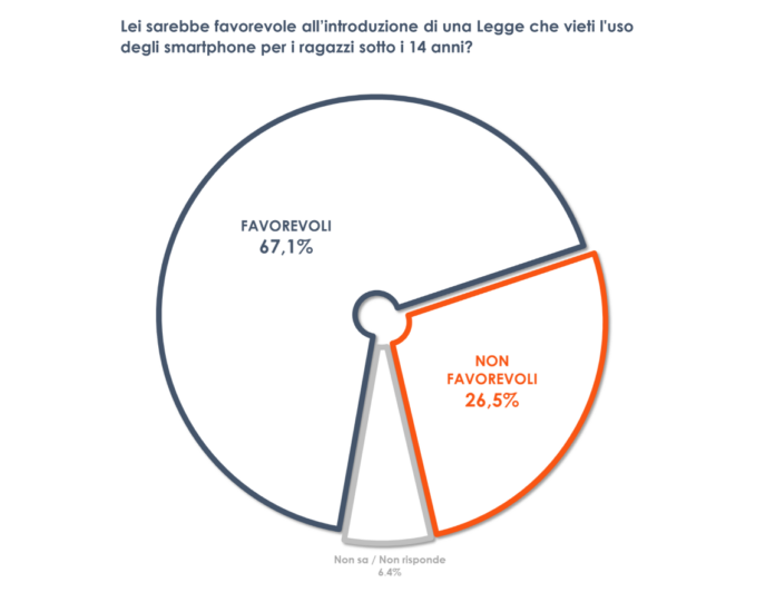 ROMA (ITALPRESS) – Più volte, il dibattito pubblico e politico si è interrogato sulla possibilità di introdurre delle regolamentazioni e delle limitazioni sull’utilizzo degli smartphone da parte di bambini e adolescenti. Una decisione che incontrerebbe l’approvazione di buona parte della popolazione. Due italiani su tre (il 67,1%), infatti, si dichiarano favorevoli all’introduzione di una legge che vieti l’uso degli smartphone per i ragazzi sotto i 14 anni.