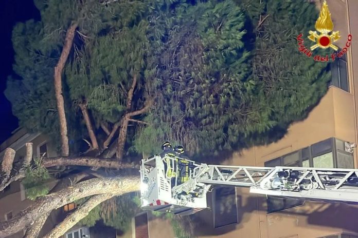 CIVITAVECCHIA (ROMA) (ITALPRESS) – Delicato intervento di soccorso tecnico quello che, nella notte, ha visto impegnati i Vigili del fuoco di Civitavecchia, dalle 21 e fino alle 4.30 in via Apollodoro. Due pini di grandi dimensioni hanno ceduto adagiandosi sulla facciata di un’abitazione. Non si sono registrati feriti.