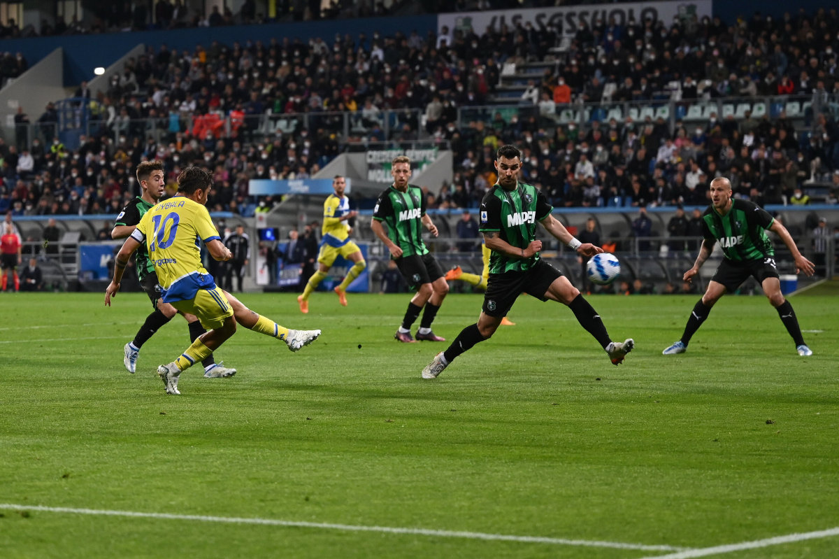 Il primo squillo è degli emiliani e arriva al 10′, quando Raspadori salta Danilo e scaglia un gran destro dal limite verso l’incrocio lontano che esce di un soffio. Al 17′ Berardi calcia un corner tagliato dalla destra trovando la testa di Frattesi che si inserisce bene ma manda alto di poco. Al 26′ Dybala perde palla, Berardi si invola verso il limite dell’area e calcia con il destro costringendo Szczesny alla parata in angolo. I neroverdi dominano e al 34′ ripartono alla grande palla al piede, portando Scamacca al tiro con il destro, ma Szczesny è ancora una volta attento e devia in tuffo. Il meritato vantaggio dei padroni di casa arriva al 38′. Kyriakopoulos serve Berardi, che con un delizioso colpo di tacco manda al tiro Raspadori che batte Szczesny sul suo palo con il mancino.